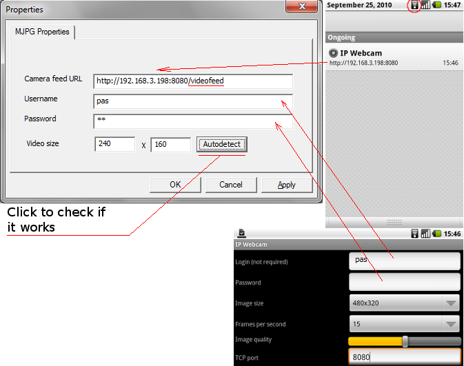 Note : Pour une compatibilité maximum mettez la résolution de la caméra sur 320x240.
